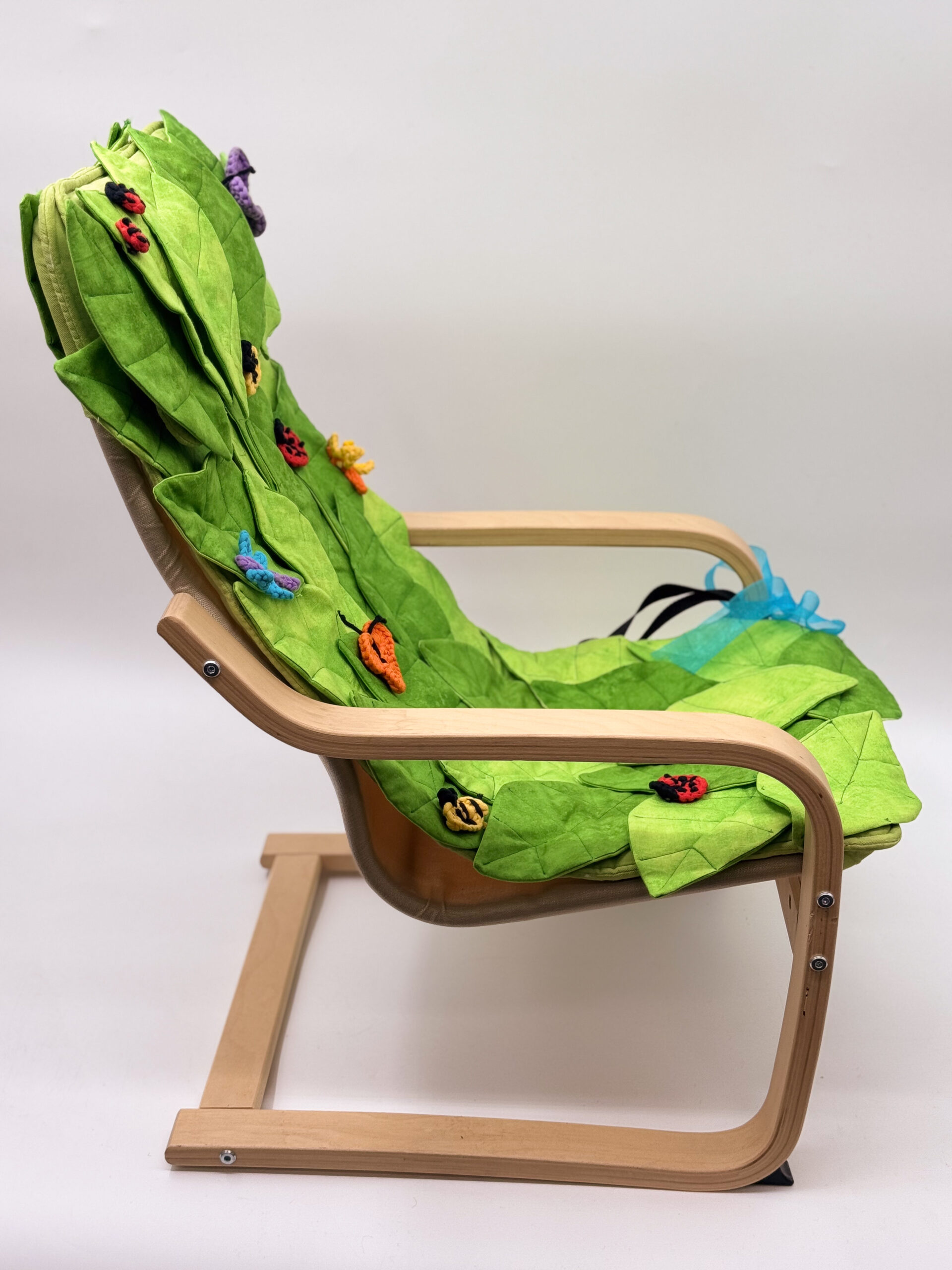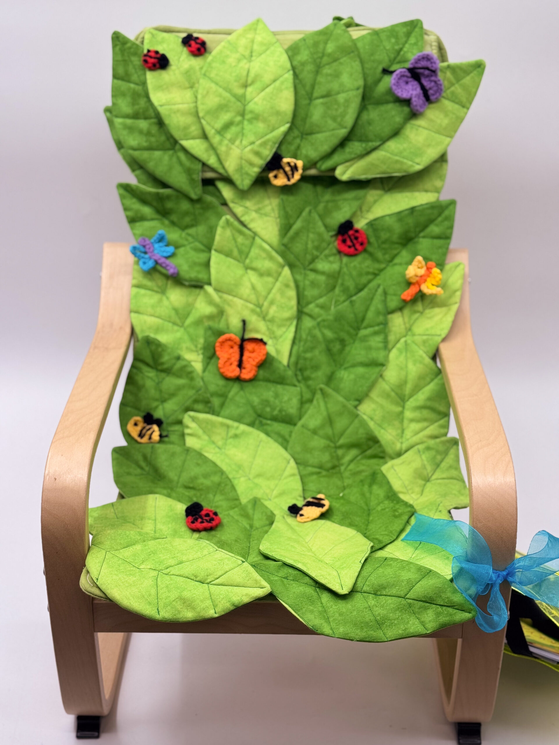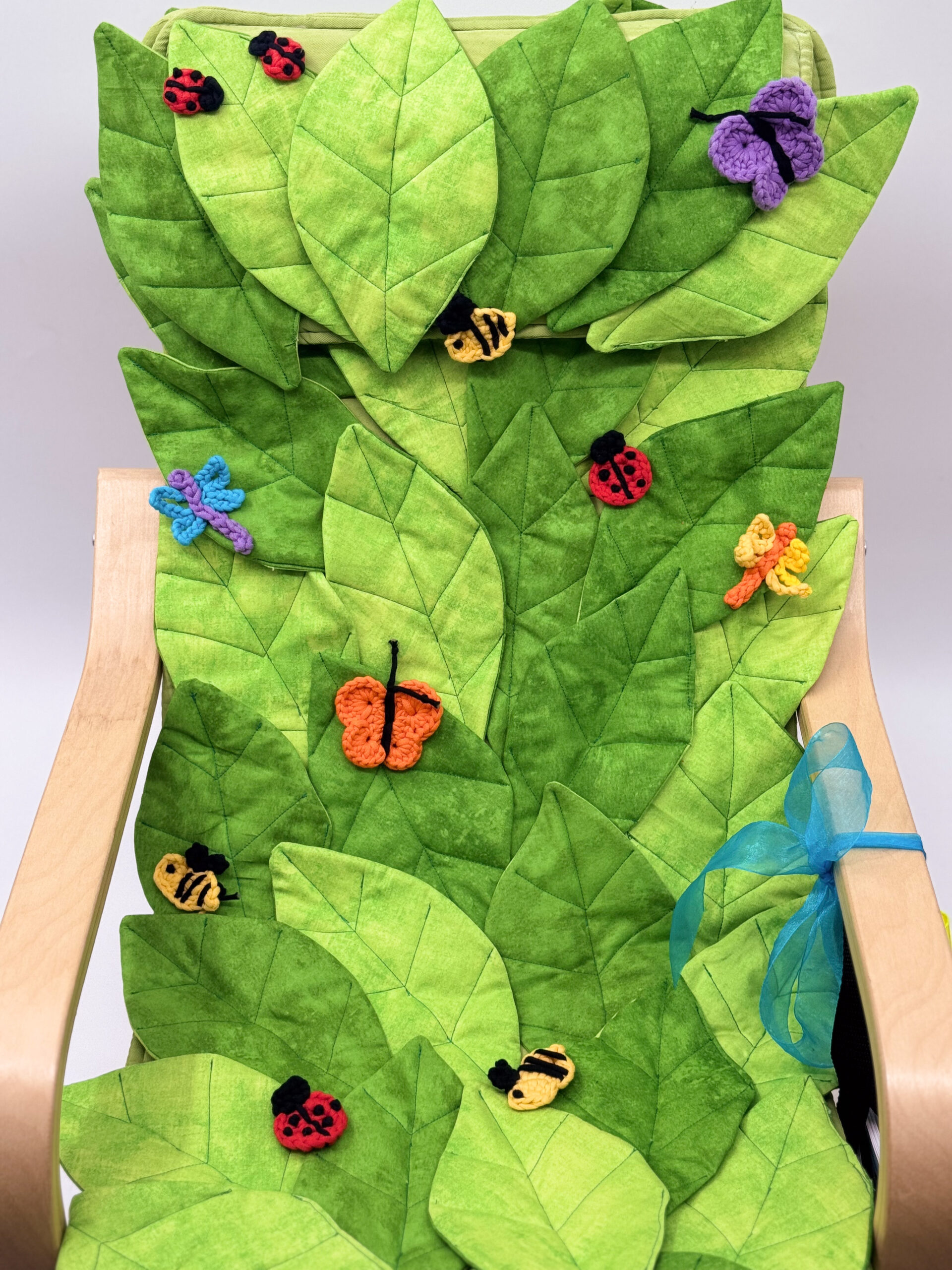 This whimsical and fun chair is the result of a mother-daughter collaboration by long-time chair artists. This comfy and fun chair will bring one of our little neighbors comfort and hours of imaginative fun with the hand-crocheted bugs adorning it. Complete with a fun bag filled with insect-themed books, this is perfect for an aspiring young entomologist. Give a child the gift of curiosity and nature by sponsoring this chair.