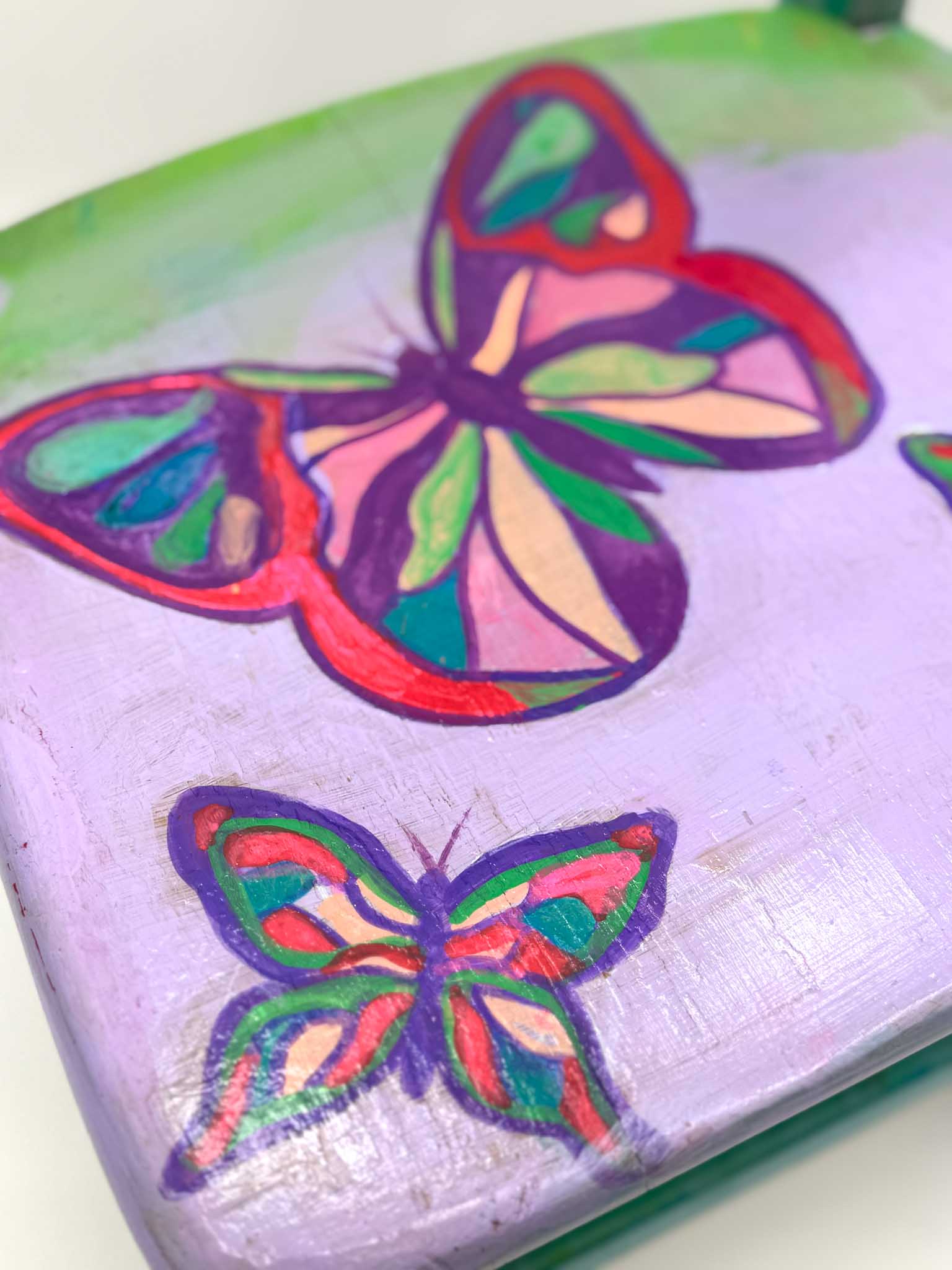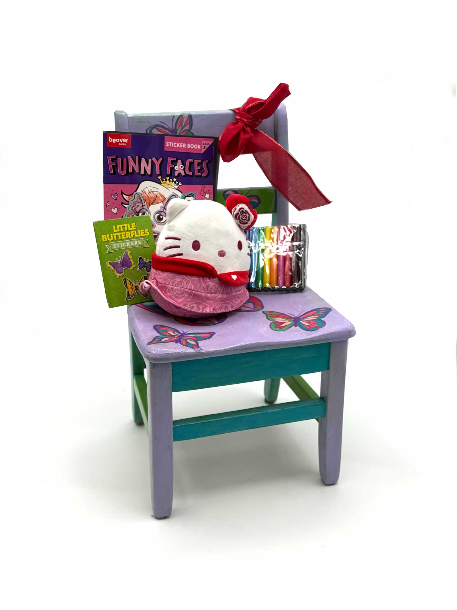 This sweet hand-painted chair feels like it fluttered straight out of a daydream. Soft lavender and teal hues frame delicate butterflies dancing across the seat and back, finished with a bright ribbon detail for an extra touch of whimsy. Perfect for a child’s room, reading nook, or craft corner, this chair offers a cozy place for imagination to take flight.