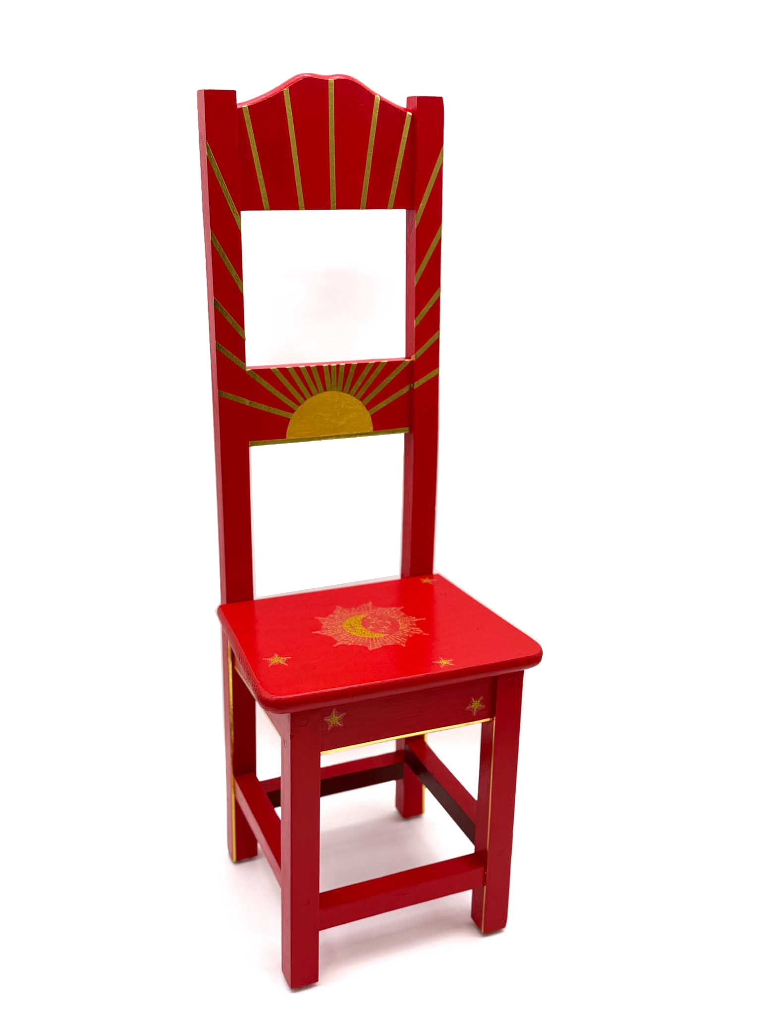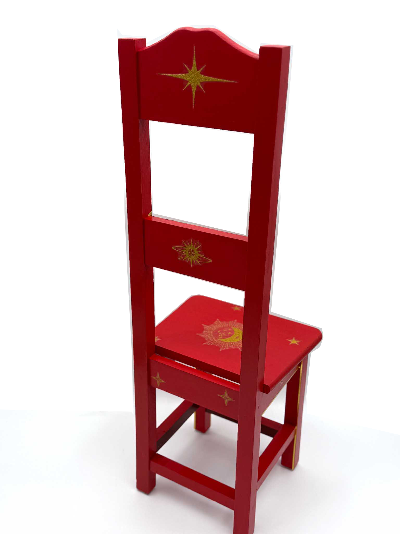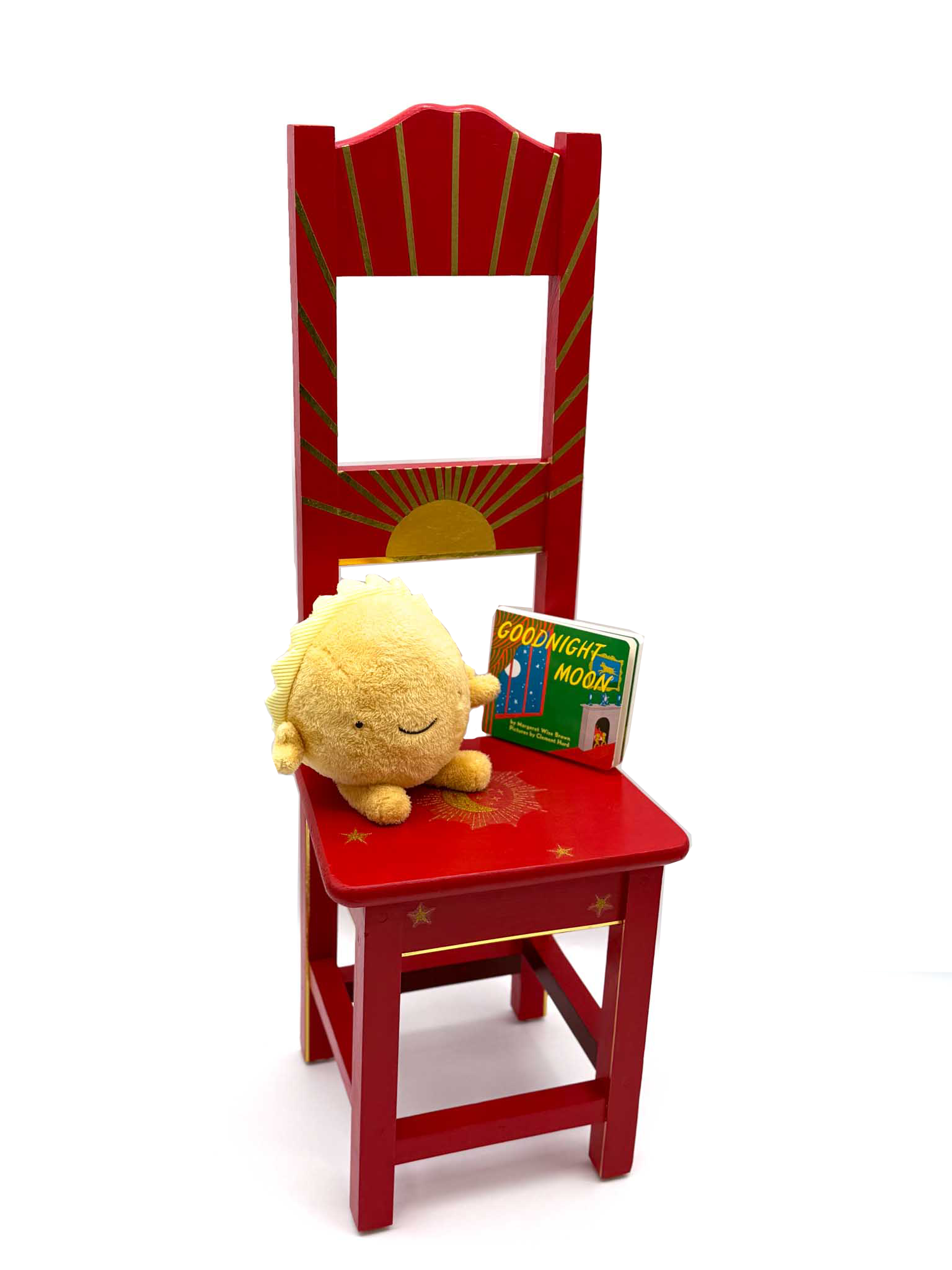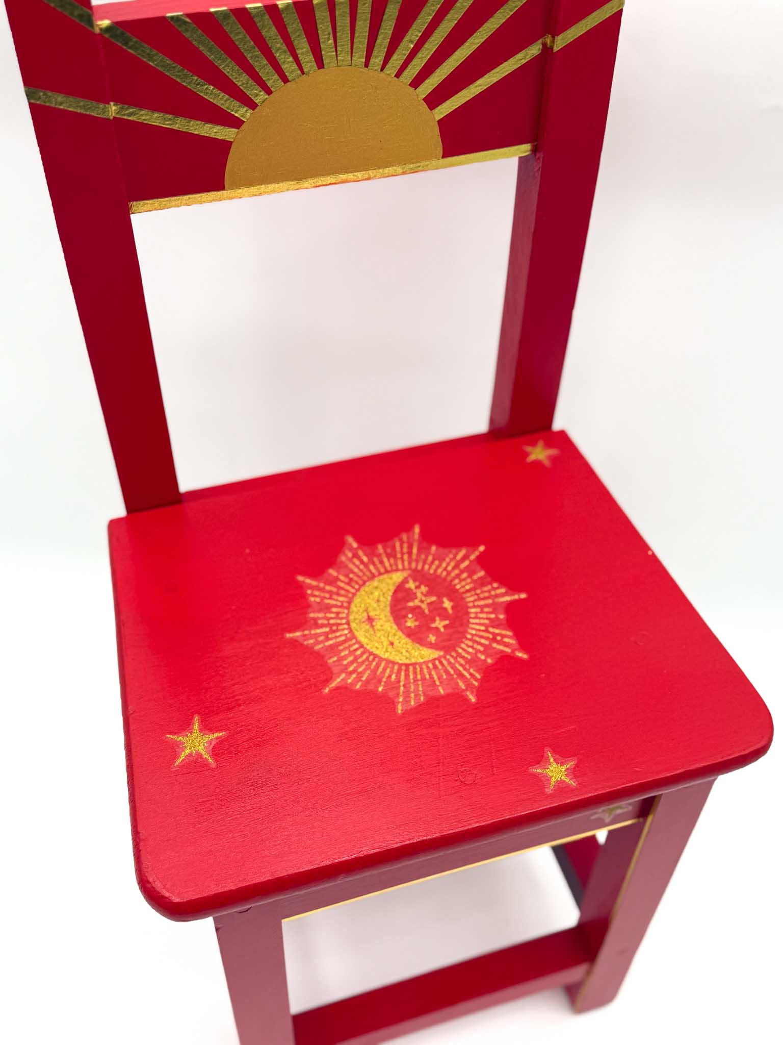 Radiant and celestial, this hand-painted chair shines with warmth and wonder. A brilliant red frame is adorned with golden sunbursts and cosmic details, inviting big dreams and bright futures. Perfect for a little stargazer’s room, it offers a special place to sit, imagine, and reach for the stars.