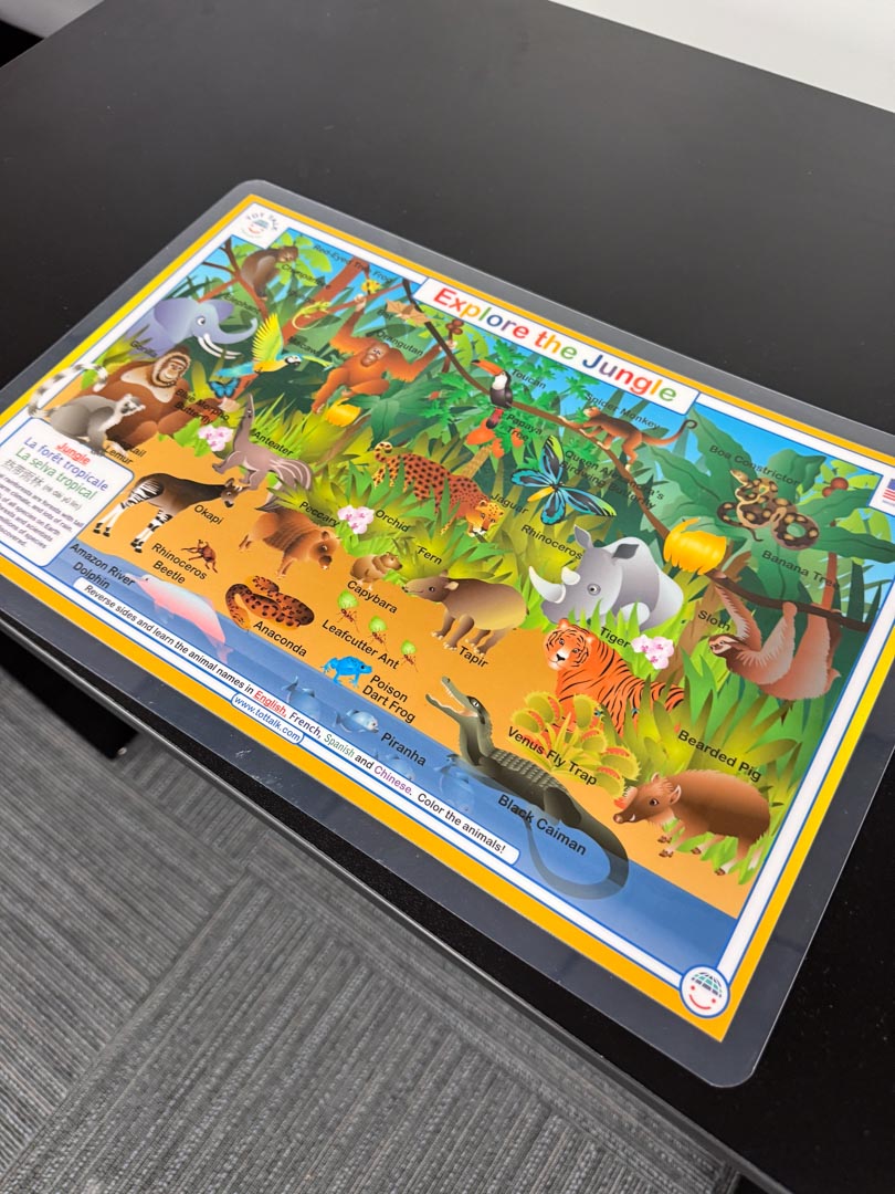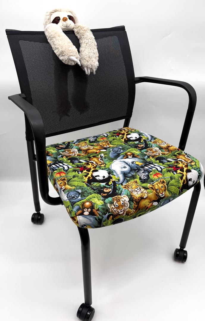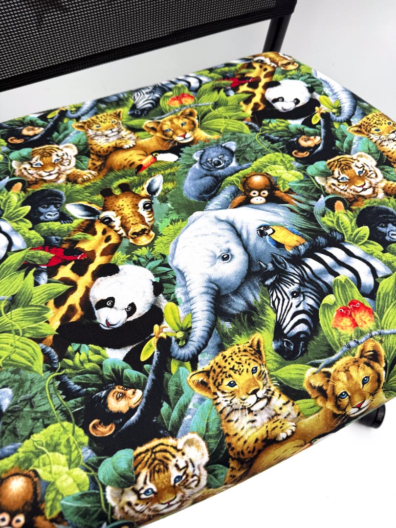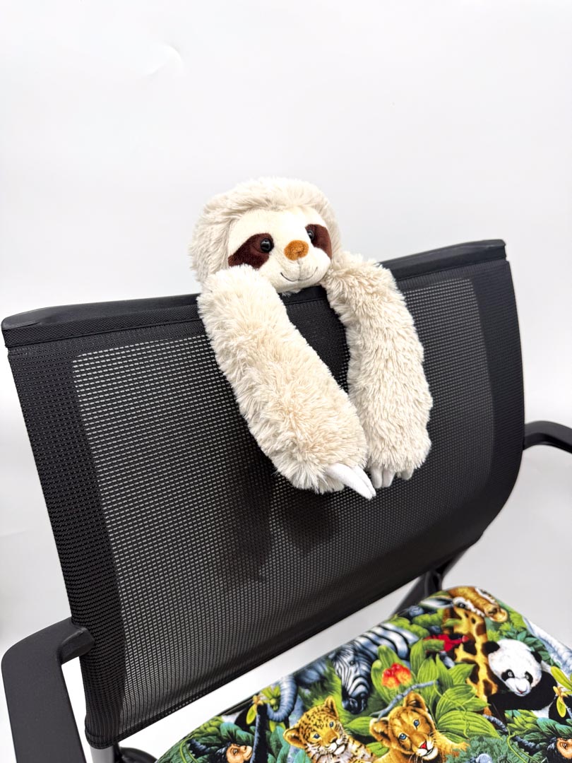 “Jungle Friends 1” by Element brings a playful canopy of comfort to the Children’s Chairs collection. The upholstered seat is wrapped in lush jungle-themed fabric and features a cuddly plush sloth companion, inviting kids into a calm, imaginative hideaway.