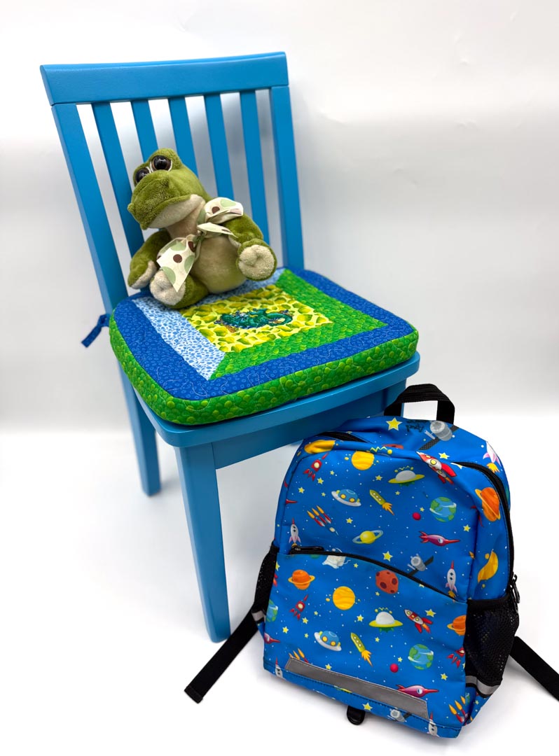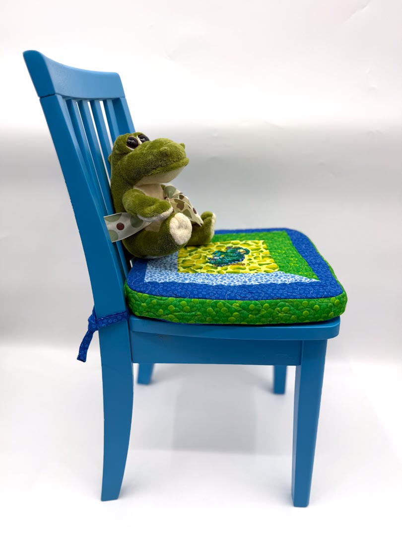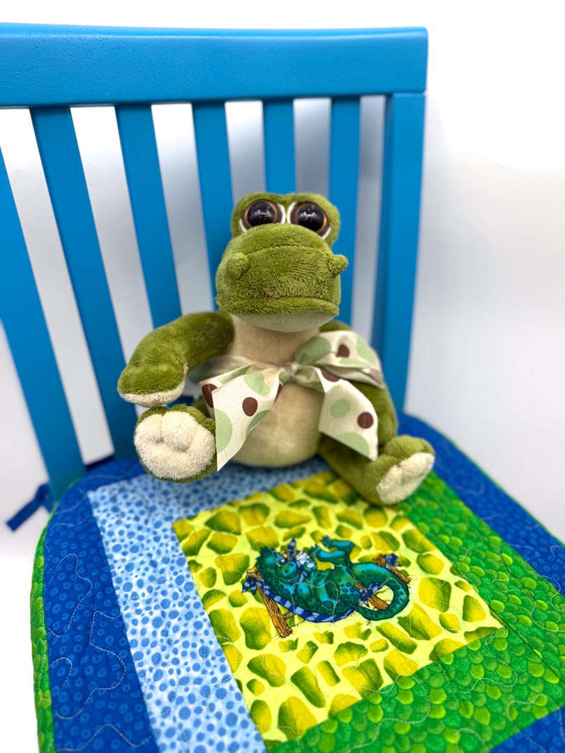 This cozy, hand-crafted chair is made for storytime adventures and snuggly moments. Painted in calming blue tones, it features a soft, sewn cushion with a friendly dinosaur and a cheerful plush frog perched along the backrest for an extra touch of companionship. Warm and inviting, it’s the perfect place for a child to curl up, turn pages, and let their imagination leap into new worlds.
