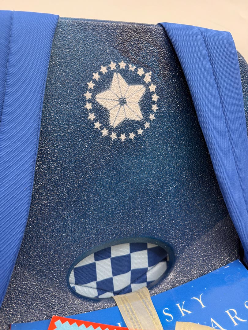 This dreamy, hand-painted chair captures the magic of a clear sky. Dark blue tones are sprinkled with glittery speckles that shimmer like distant stars, while a bold star stencil on the backrest, it’s a perfect place for a child to sit, relax, and let their imagination drift among the blue sky and white stars.