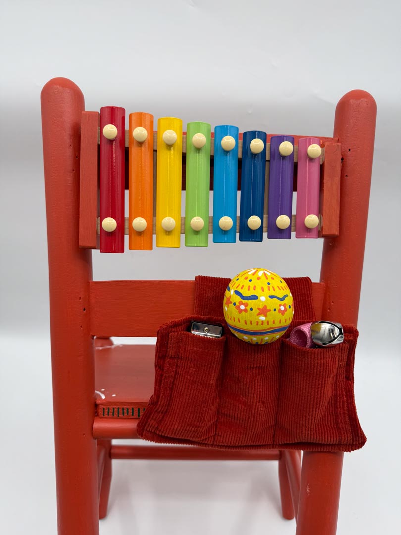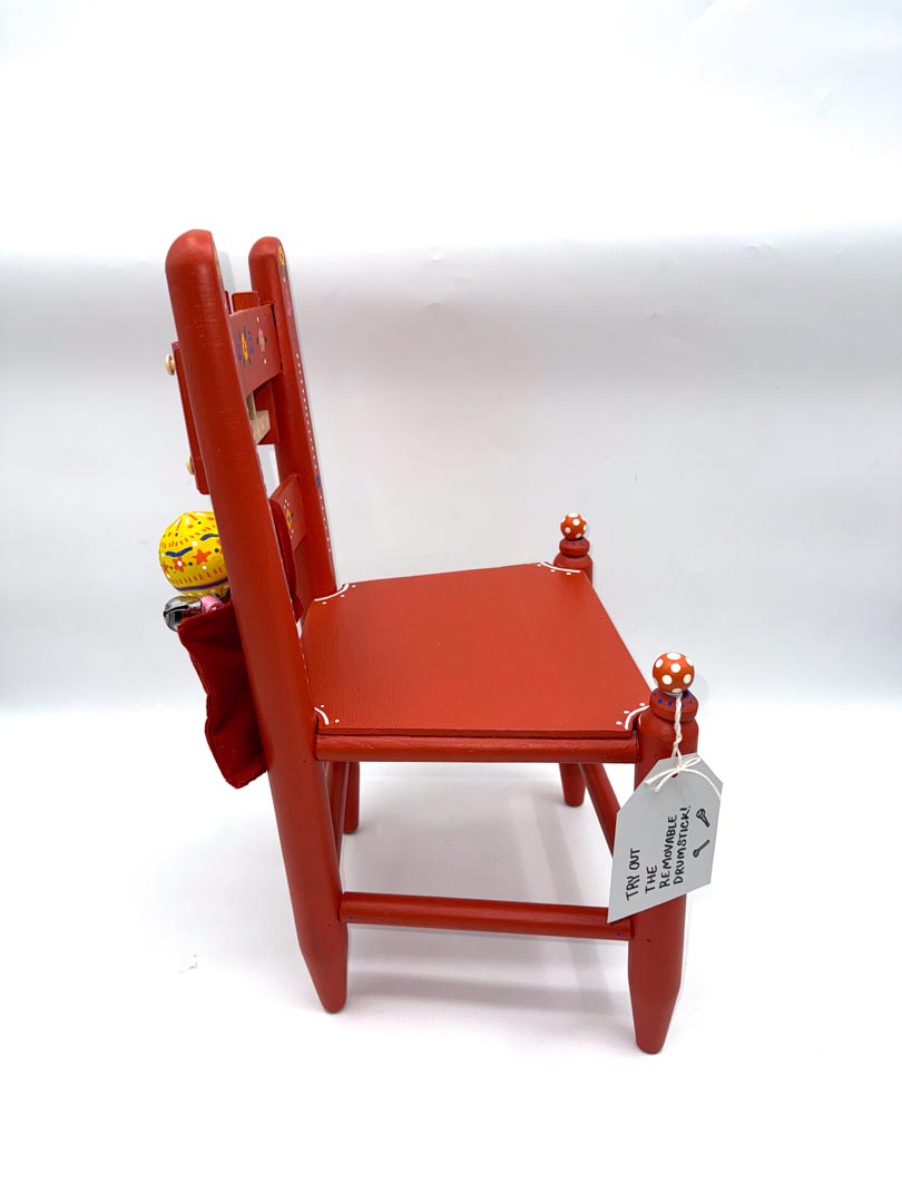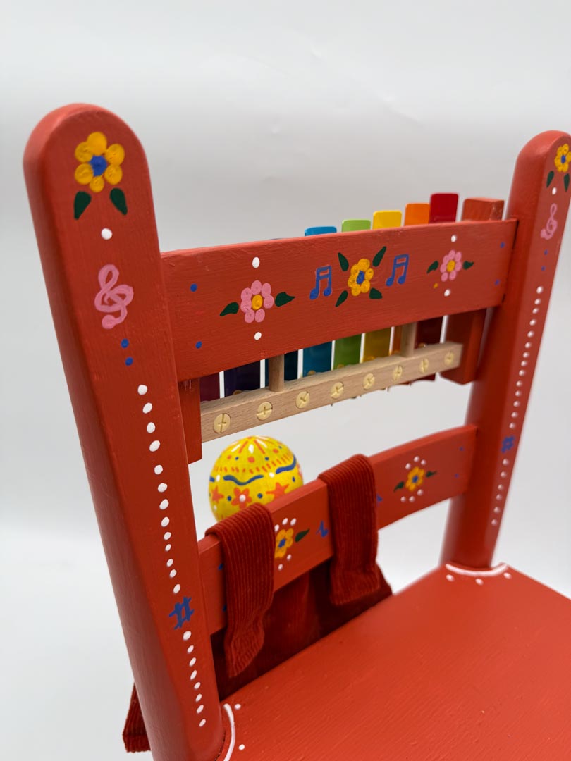 This lively, hand-crafted chair turns every moment into a mini jam session. Painted in vibrant red and decorated with playful hand-painted patterns, it features a built-in xylophone with a removable mallet that tucks neatly into the chair, along with a harmonica and shakers for even more musical fun. Created by our wonderful partners at Big Rocks Organizing, this interactive piece invites children to explore rhythm, sound, and creativity—making it the perfect seat for little musicians ready to make some noise.