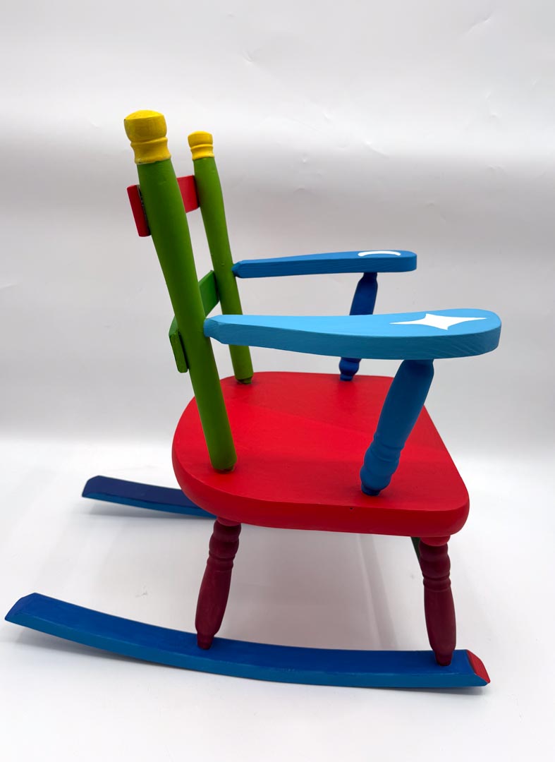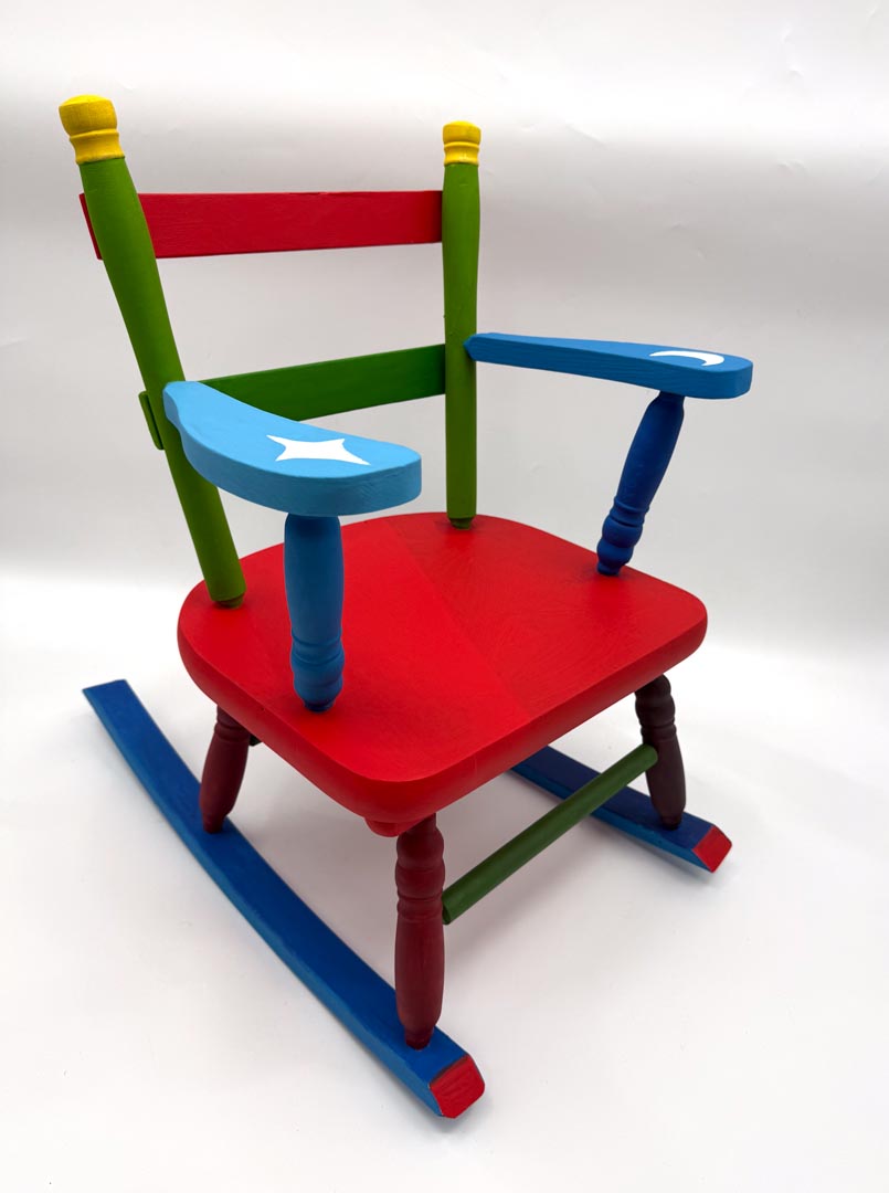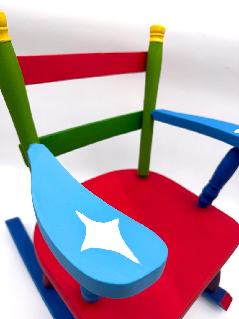 This cheerful, hand-painted rocking chair is bursting with color and charm. A vibrant red seat is paired with a bright green back and sunny yellow top, creating a playful, eye-catching palette. Stars and a crescent moon dance along the armrests, adding a touch of nighttime magic to its design.