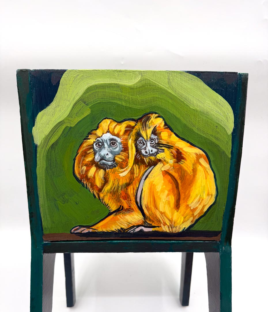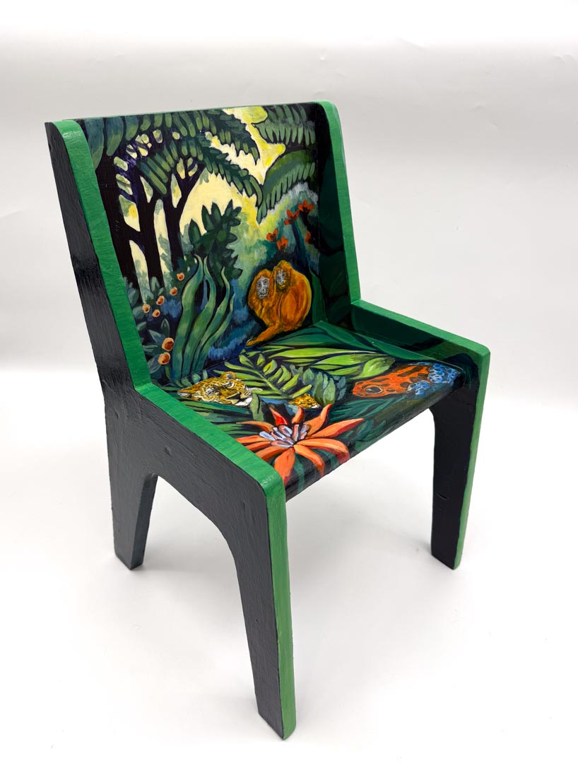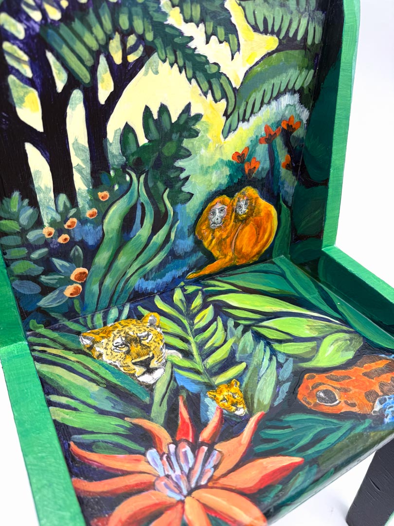 This vibrant, hand-painted chair brings the rainforest to life in stunning detail. Playful monkeys, stealthy leopards, and bright jungle frogs peek out from layers of lush, green vegetation that wrap around the entire piece. Full of color, texture, and discovery, it invites a child to sit, explore, and imagine adventures deep in the heart of the jungle.